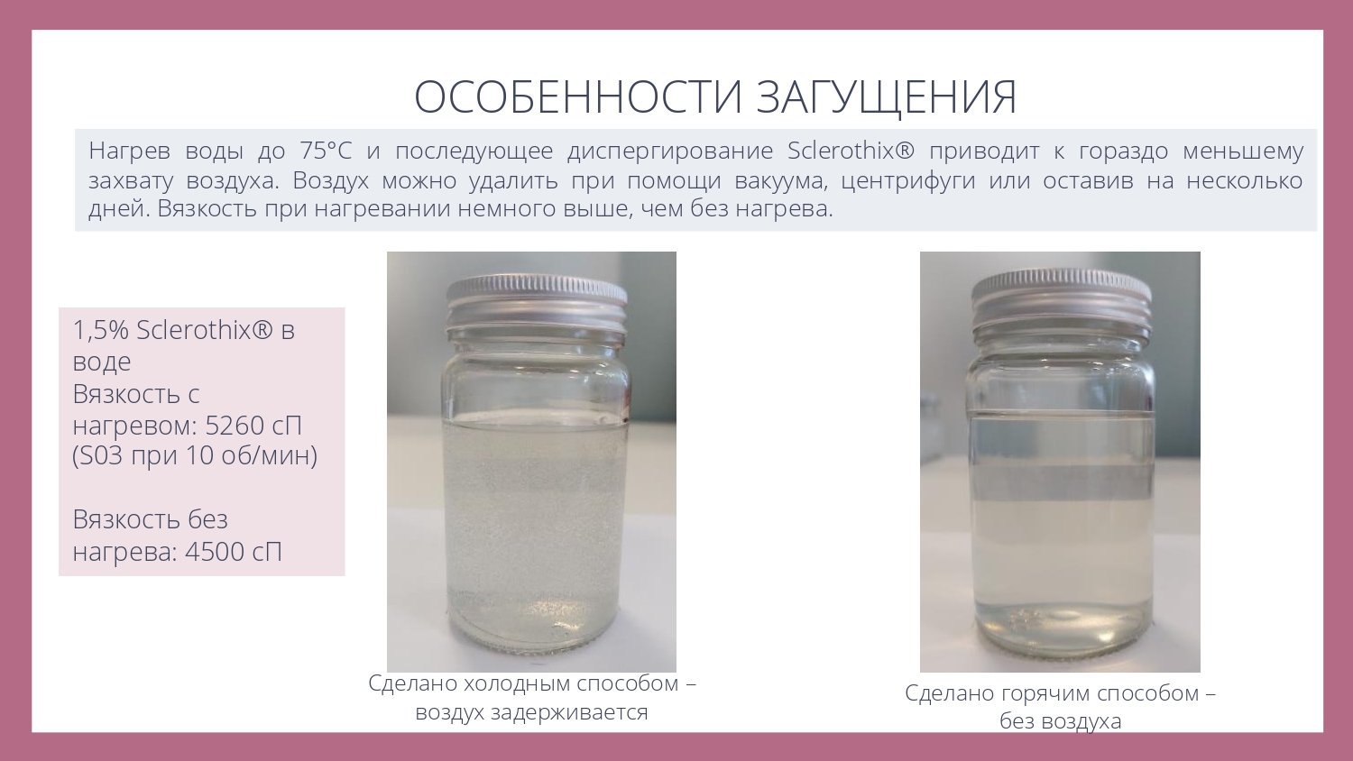Sclerothix является эффективной добавкой для улучшения суспендирования (подвешивания) различных частиц - скрабов, глин или пигментов, в том числе в составе моющих систем.