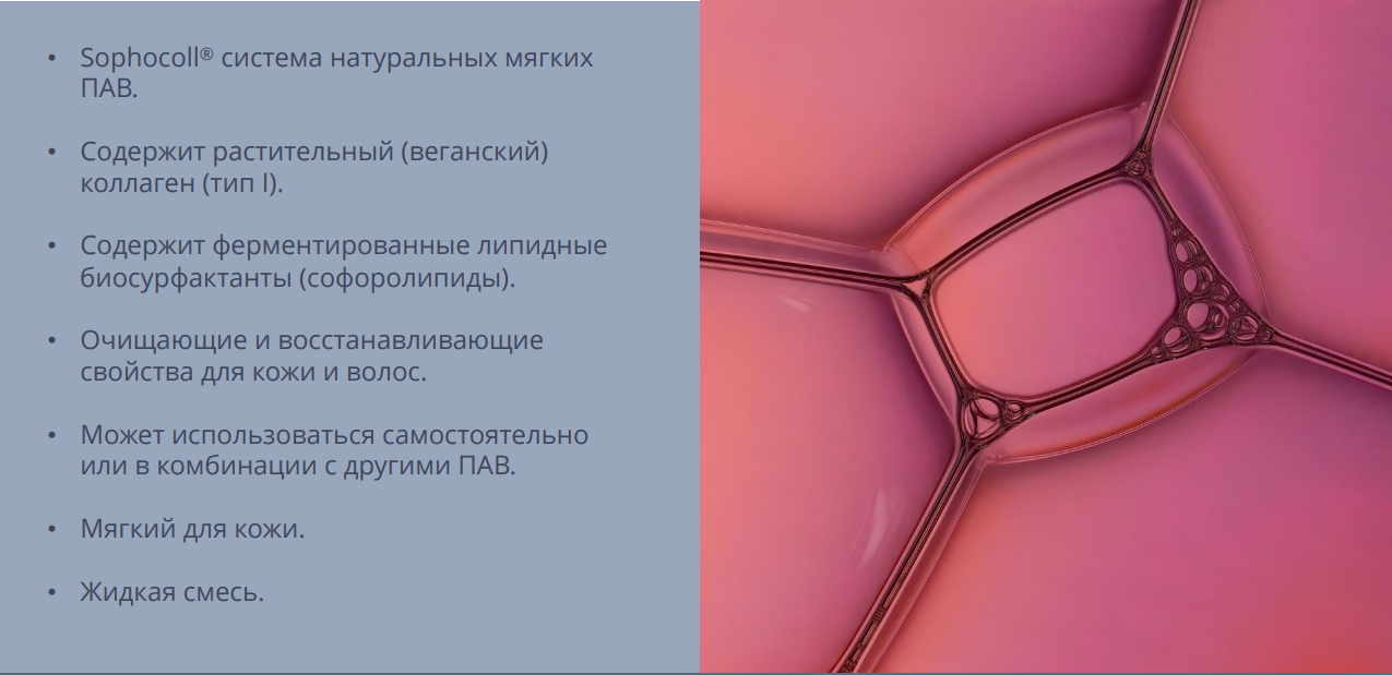 Sophocoll® / Софоколл — это инновационный комплекс мягких поверхностно-активных веществ растительного происхождения, состоящий из коллагеновых аминокислот и софоролипидов. Продукт разработан для создания деликатных очищающих средств с регулируемым уровнем пены и минимальным раздражающим действием.